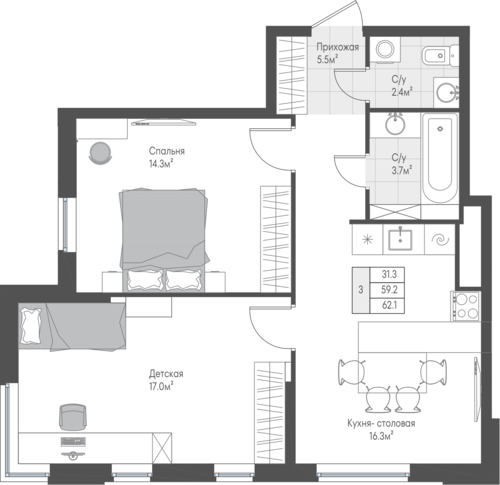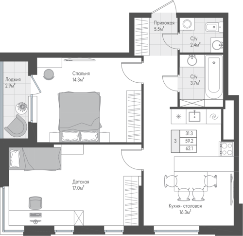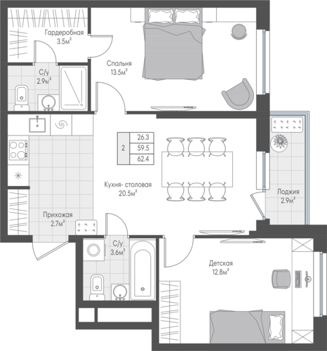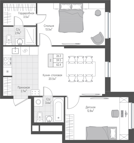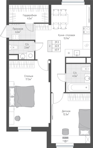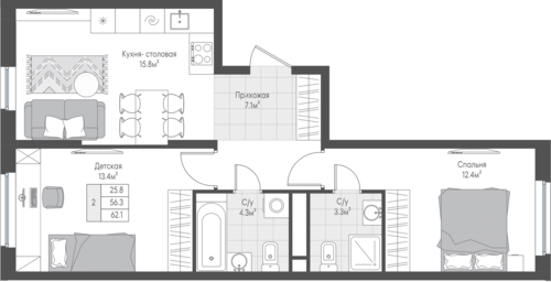 62,3 м²